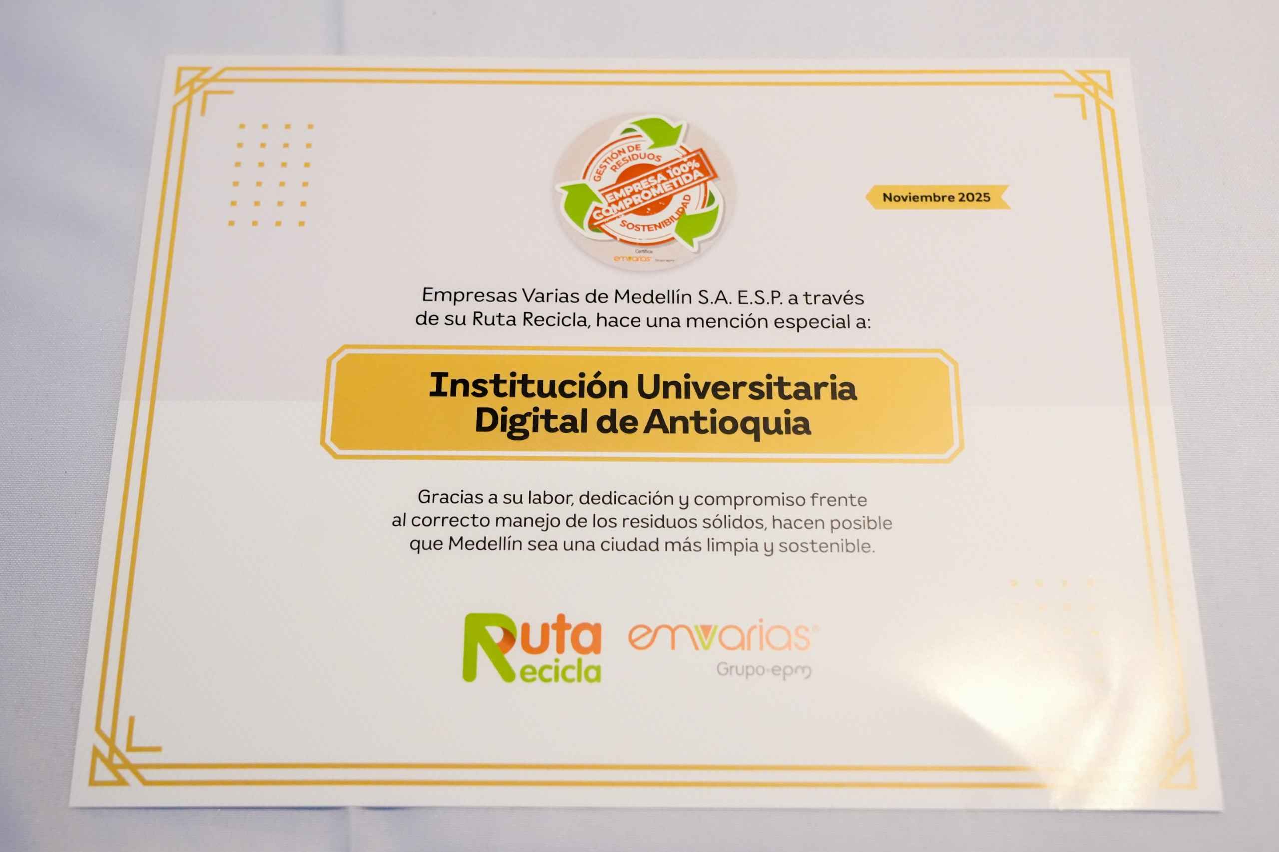 La Institución Universitaria Digital de Antioquia fue reconocida con una Mención especial en la edición 2025 del Sello Naranja, iniciativa liderada por EMVARIAS E.S.P. que distingue las mejores prácticas en gestión de residuos sólidos y economía circular en Medellín y el Área Metropolitana.